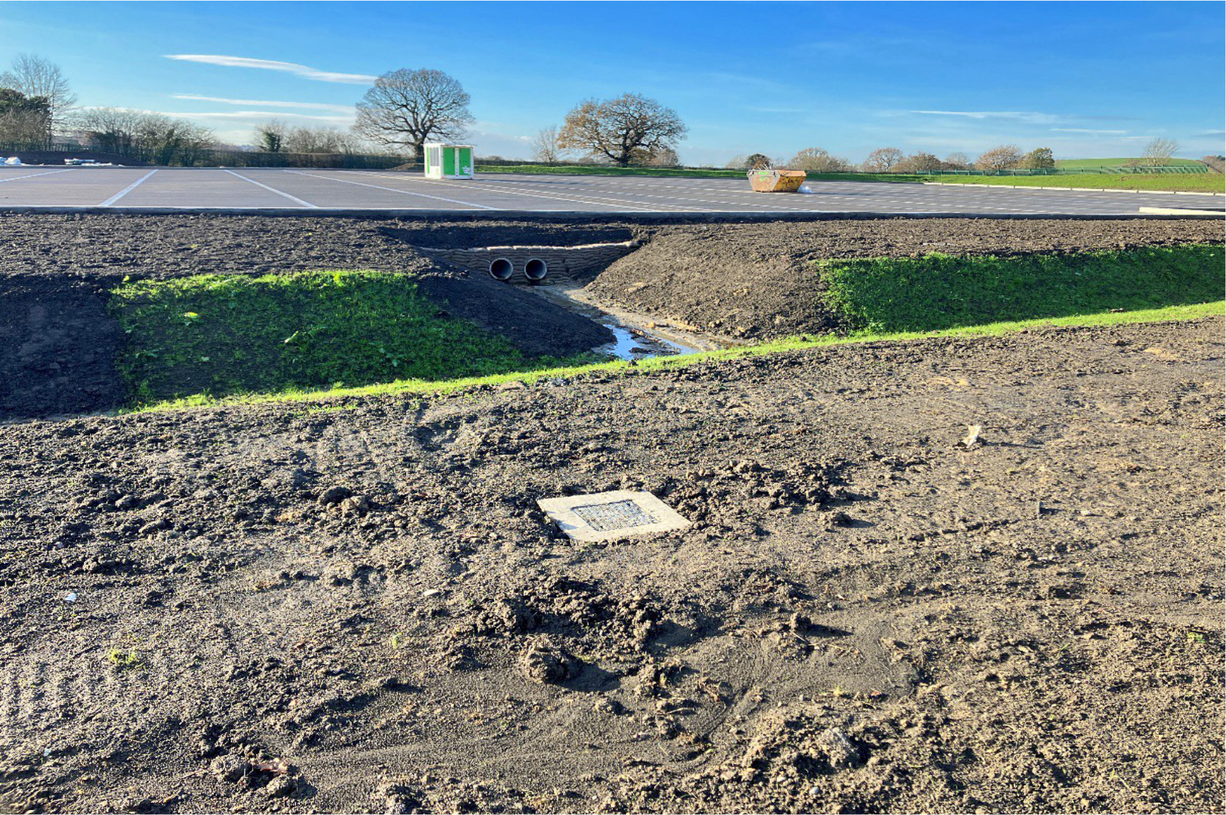 Surface water drainage was restricted to greenfield rates before flowing into a nearby watercourse. A full retention separator was included in the surface water system to protect the receiving watercourse from potential fuel and oil spills. The attenuation basin provides storage for storms up to and including the 1 in 100 year event plus an allowance for climate change. The basin was designed with micropools to enhance bio-diversity and treatment of the surface water. Excess topsoil was utilised in a bund and in the new park area to improve the landscaping.